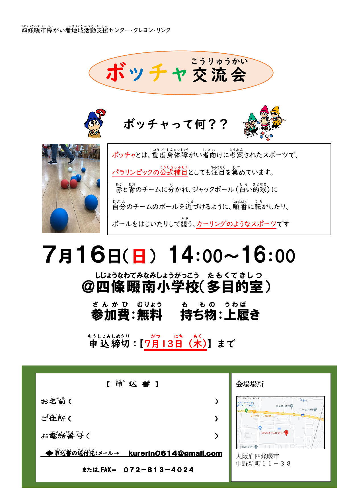 7/16(日)の14:00から、四條畷南小学校の多目的室をお借りして、『ボッチャ交流会』を行います!