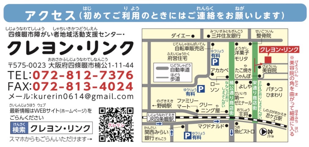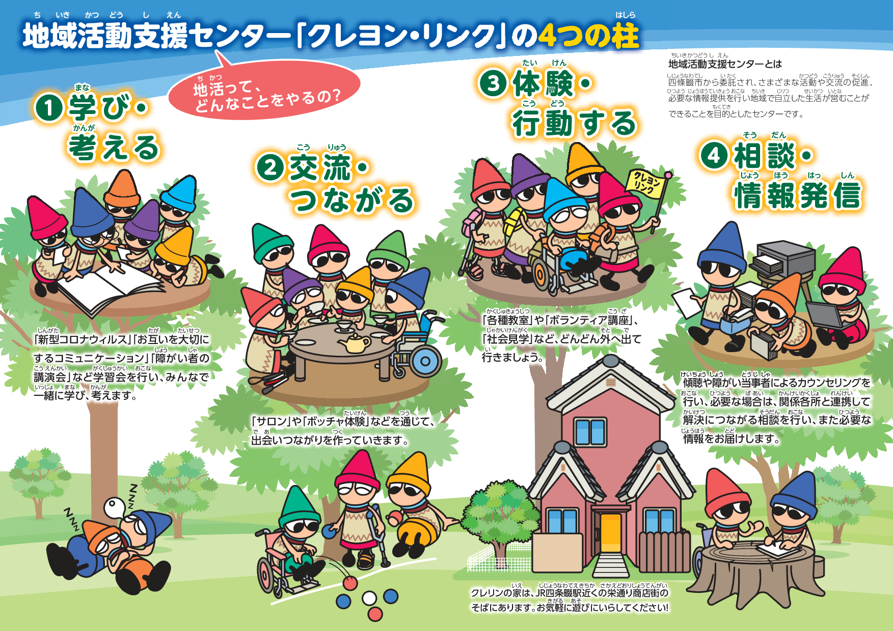 これを受け、四條畷市では「さまざまな活動や交流の促進、必要な情報提供を行い地域で自立した生活が営むことができることを目的と」して2022年公募され、私どもNPO法人クレヨン・リンクが受託しました