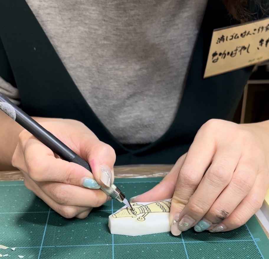 企画の最後には、先生が、クレリンの消しゴムはんこを作るところを実演してくださいました。