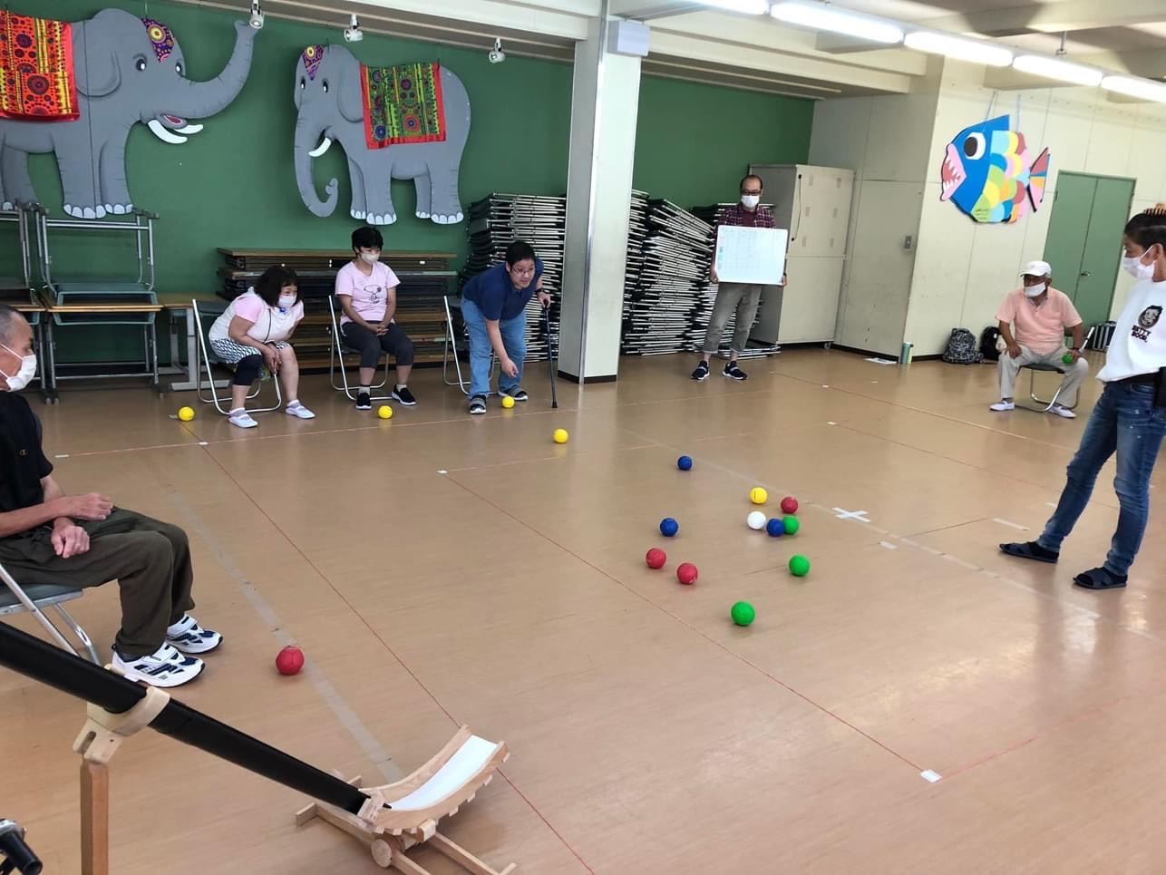 前回から採用の、四色のボールを使った「スクエアボッチャ」というルールで、ワイワイ楽しみました(^^)